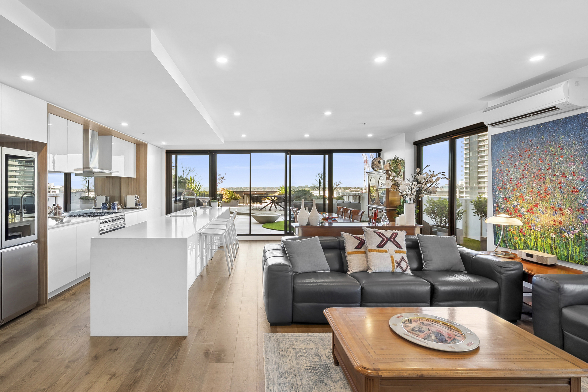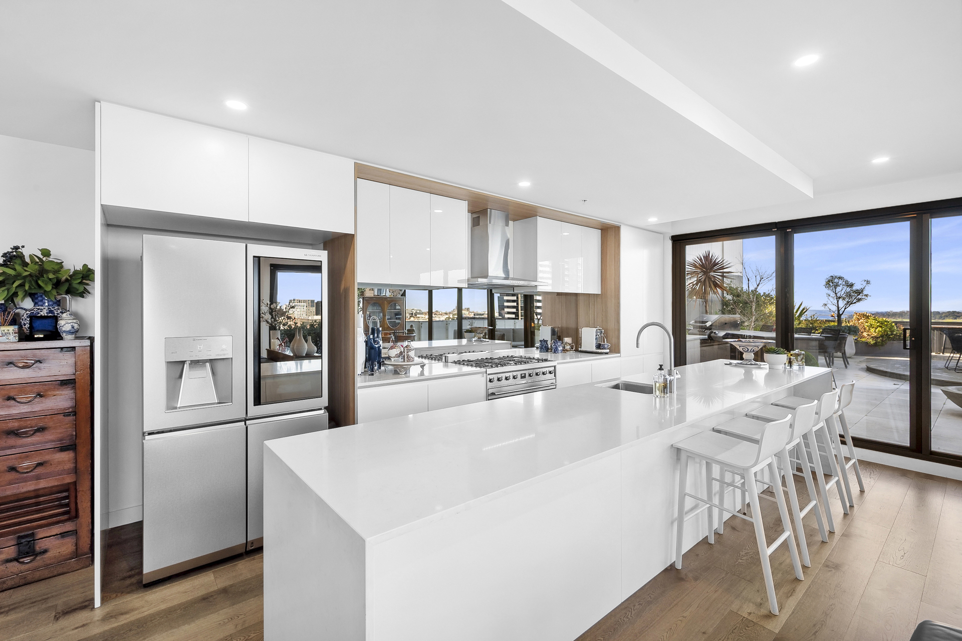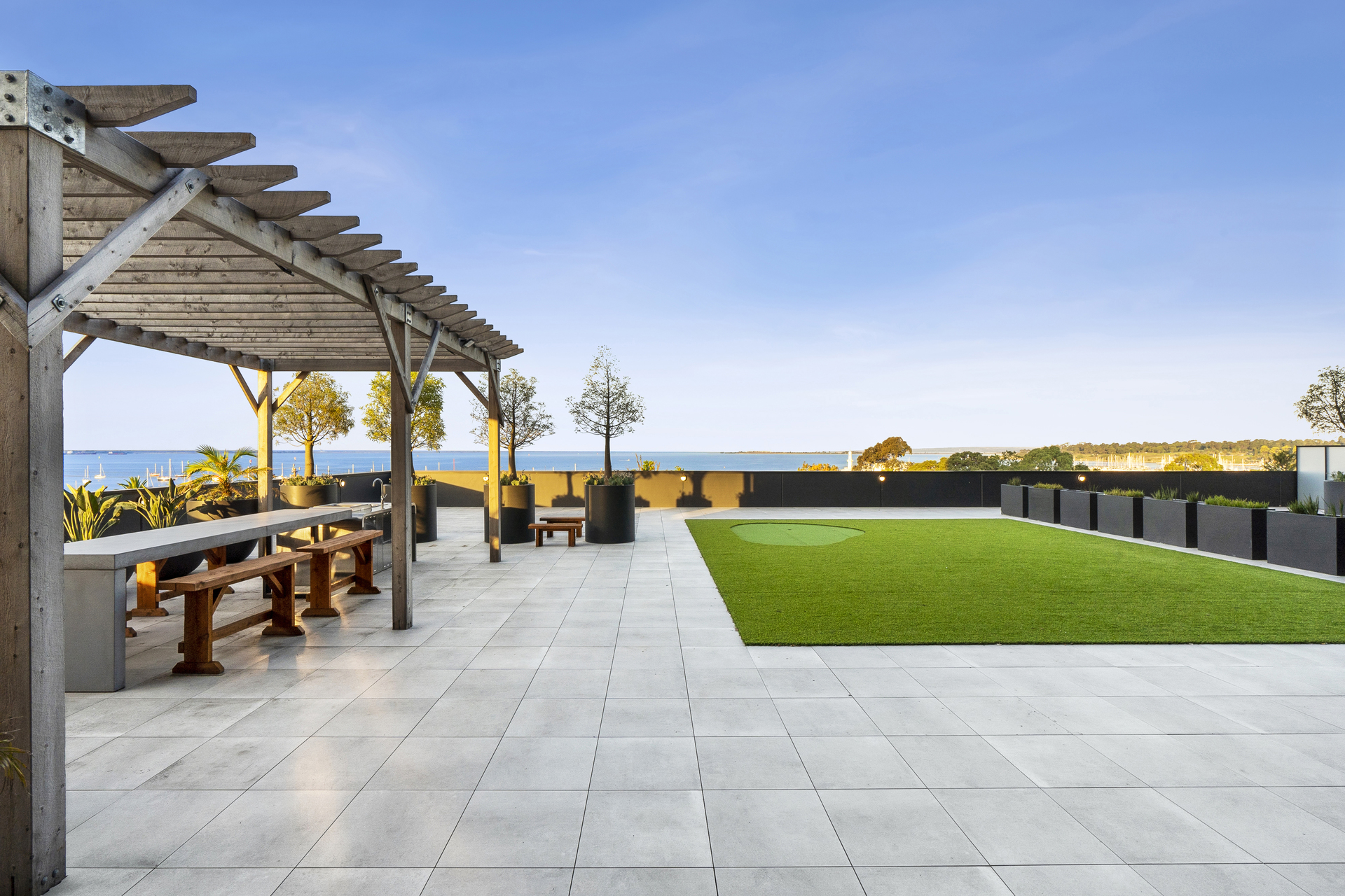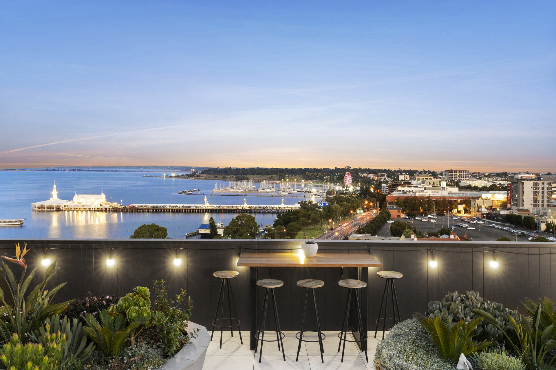 The open-plan living, kitchen and dining area offers panoramic views, leading to the finest rooftop garden terrace (over 130m²) Geelong has to offer. Designed by the renowned Christian Jenkins, the terrace features stunning gardens and a panoramic view of Geelong's waterfront and Corio Bay. The outdoor kitchen on the balcony is perfect for entertaining.