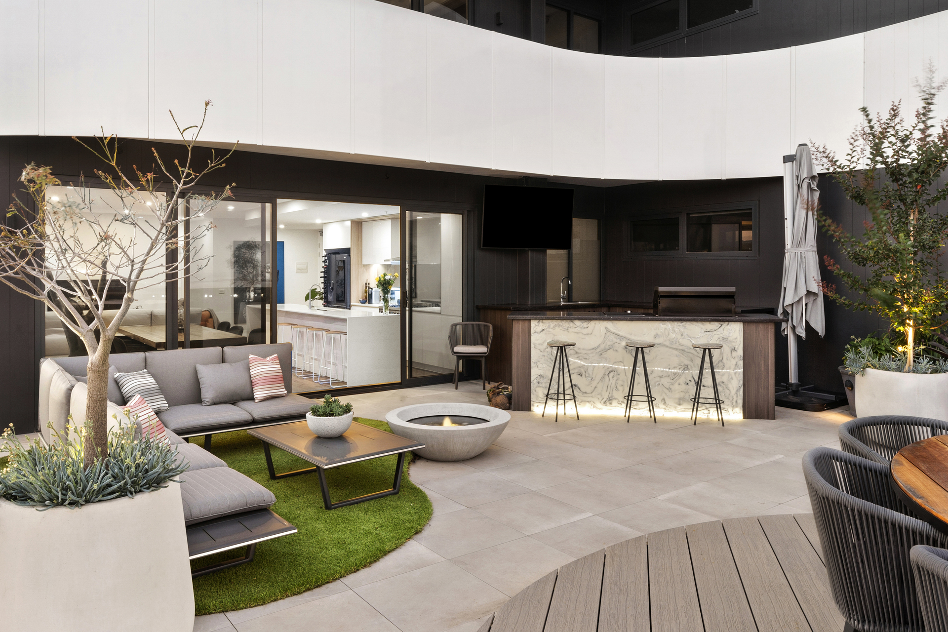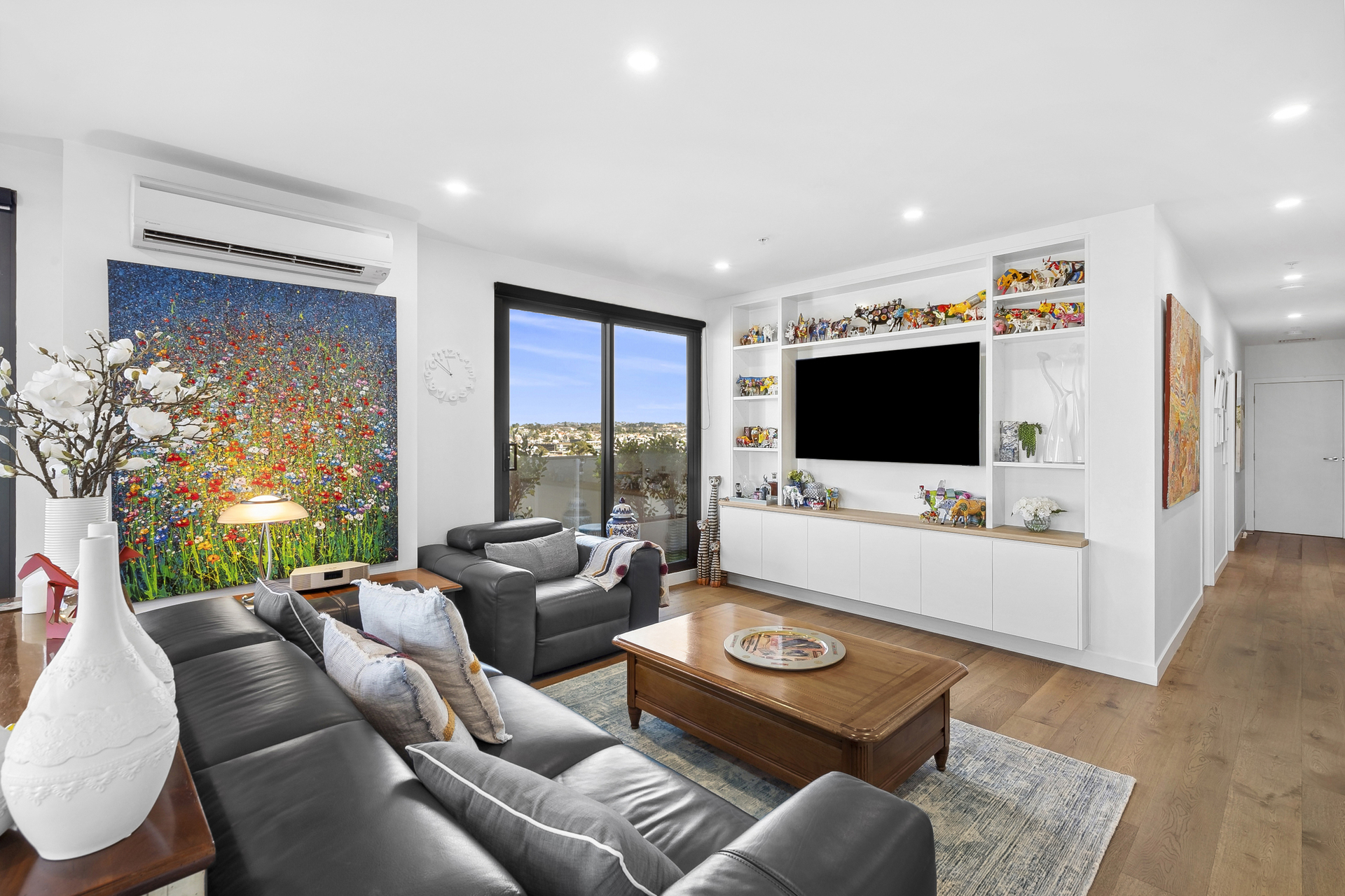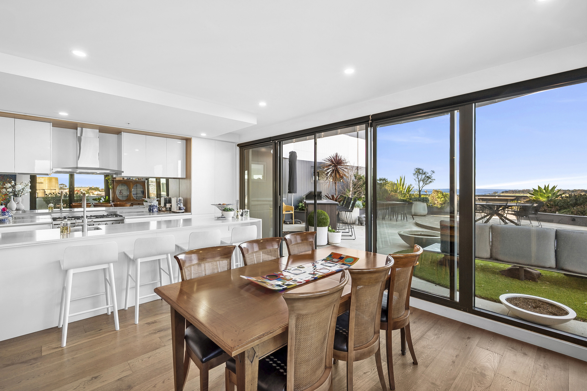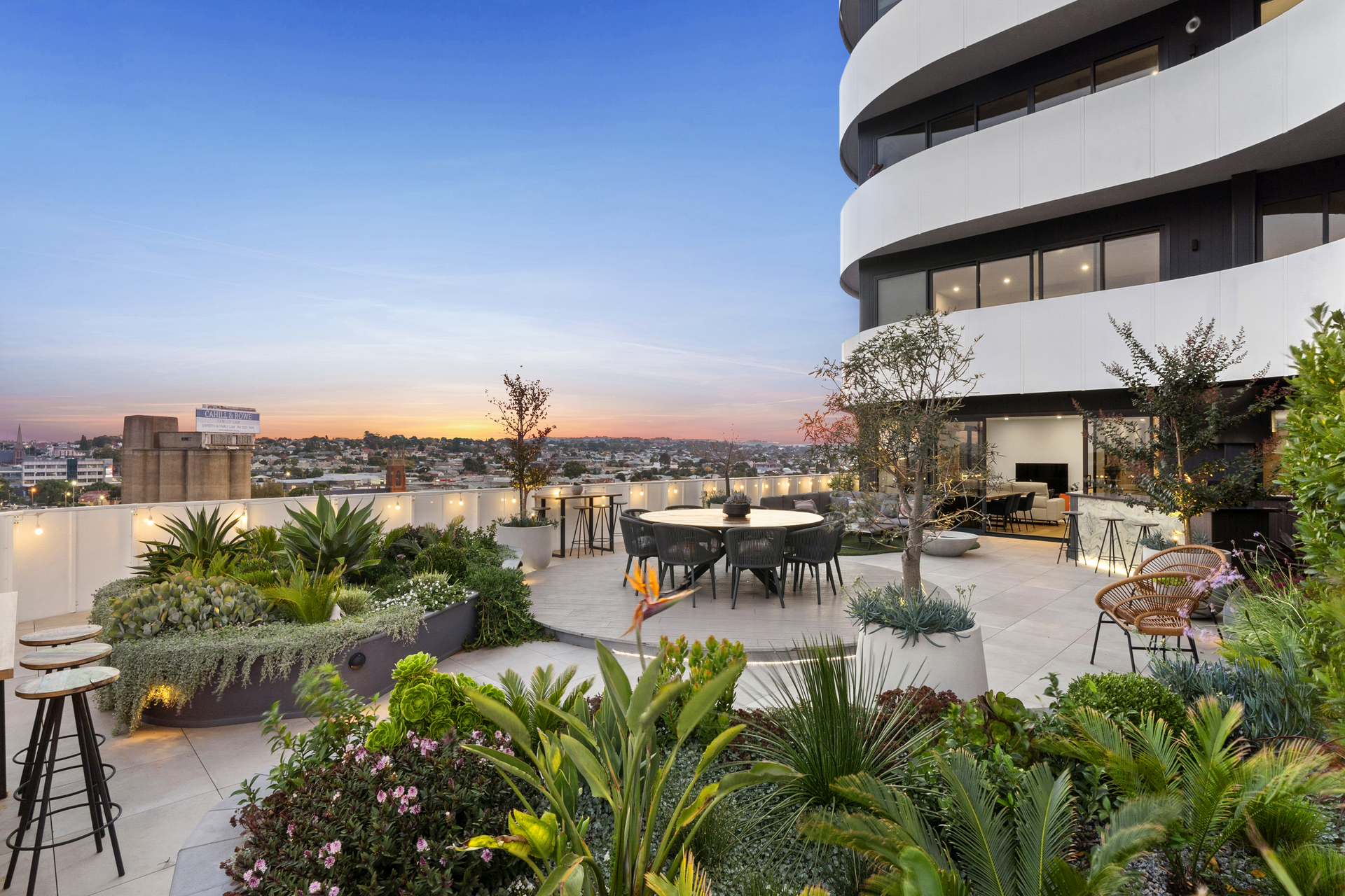 The open-plan living, kitchen and dining area offers panoramic views, leading to the finest rooftop garden terrace (over 130m²) Geelong has to offer. Designed by the renowned Christian Jenkins, the terrace features stunning gardens and a panoramic view of Geelong's waterfront and Corio Bay. The outdoor kitchen on the balcony is perfect for entertaining.