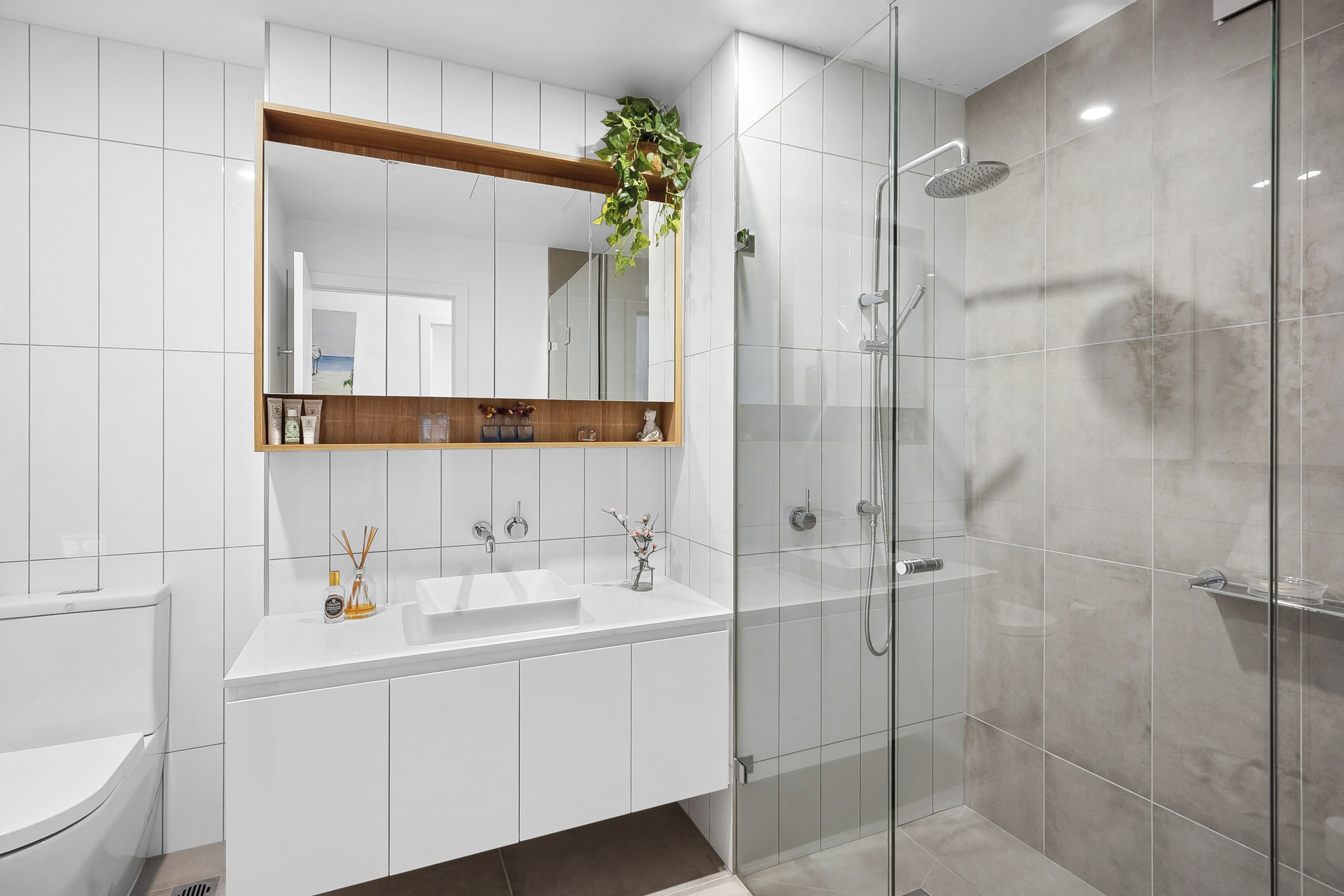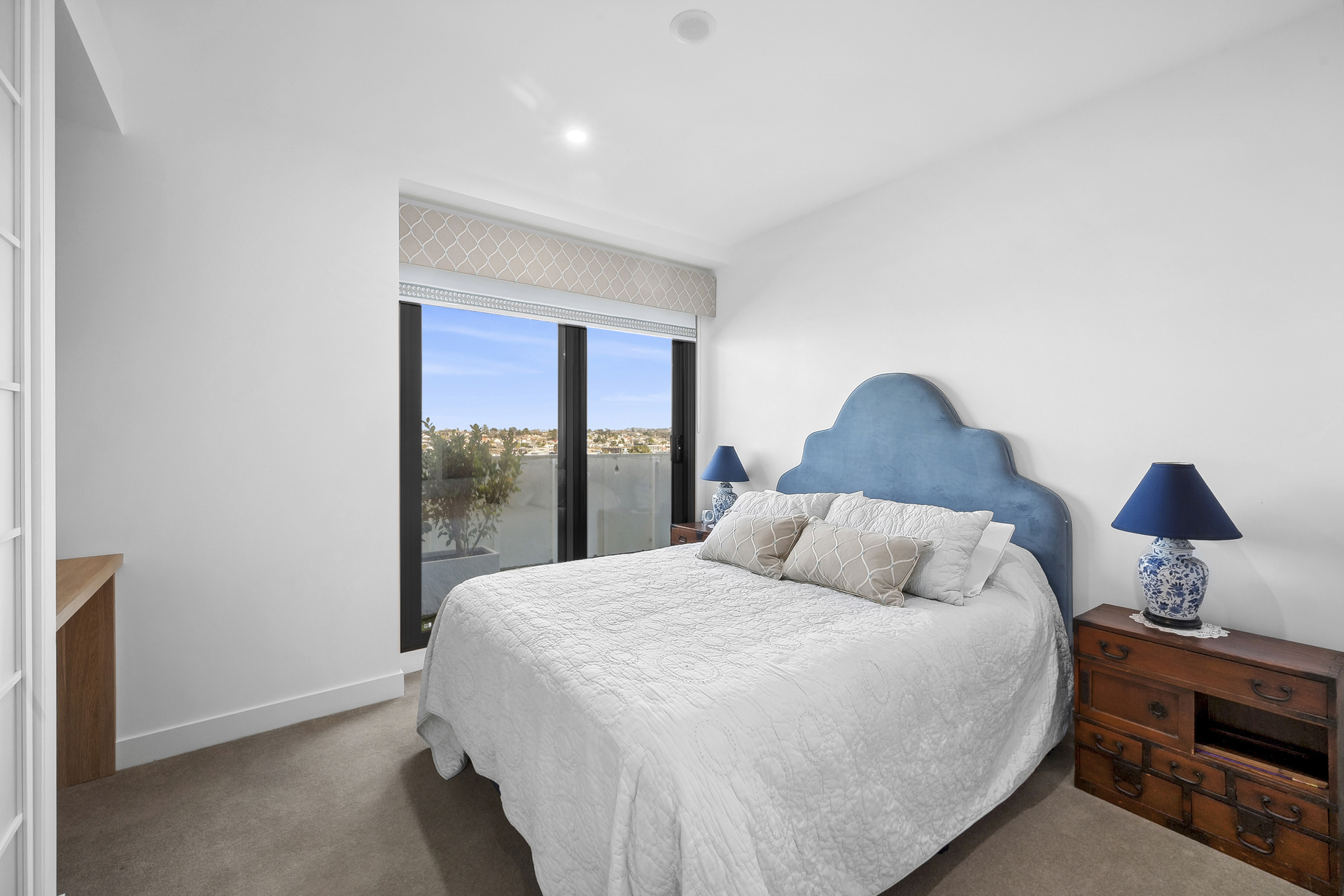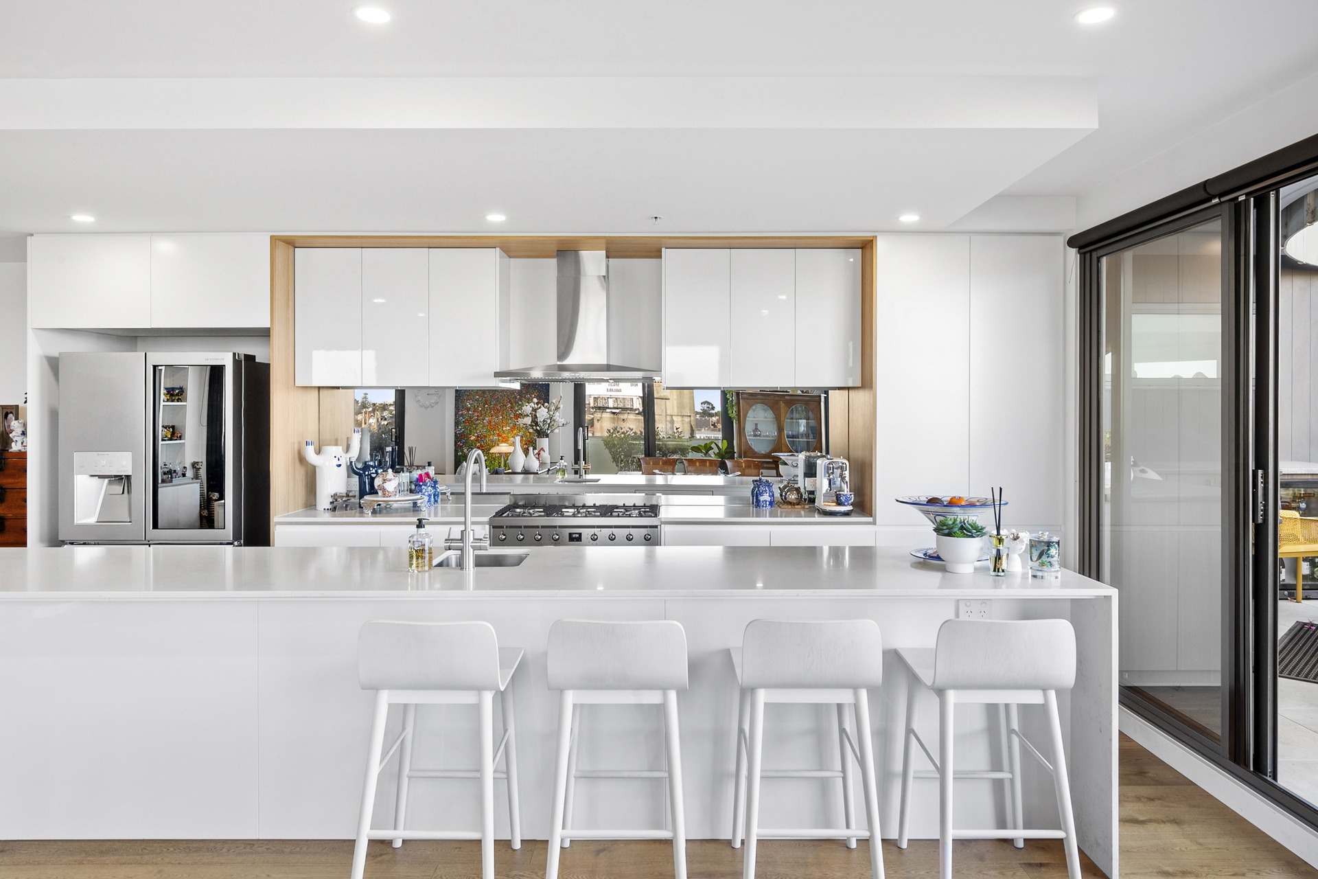 The spacious open-plan living area with large windows provides natural light and stunning views. The functional kitchen includes a 900mm stainless-steel oven and cooktop, a four-metre island bench with a stone waterfall, stainless steel appliances, an integrated dishwasher and a warming drawer. A nearby butler's pantry offers extra storage or can be used as a utility room, equipped with a drying cabinet. The penthouse features automated window furnishings and retractable flyscreens on the sliding doors.