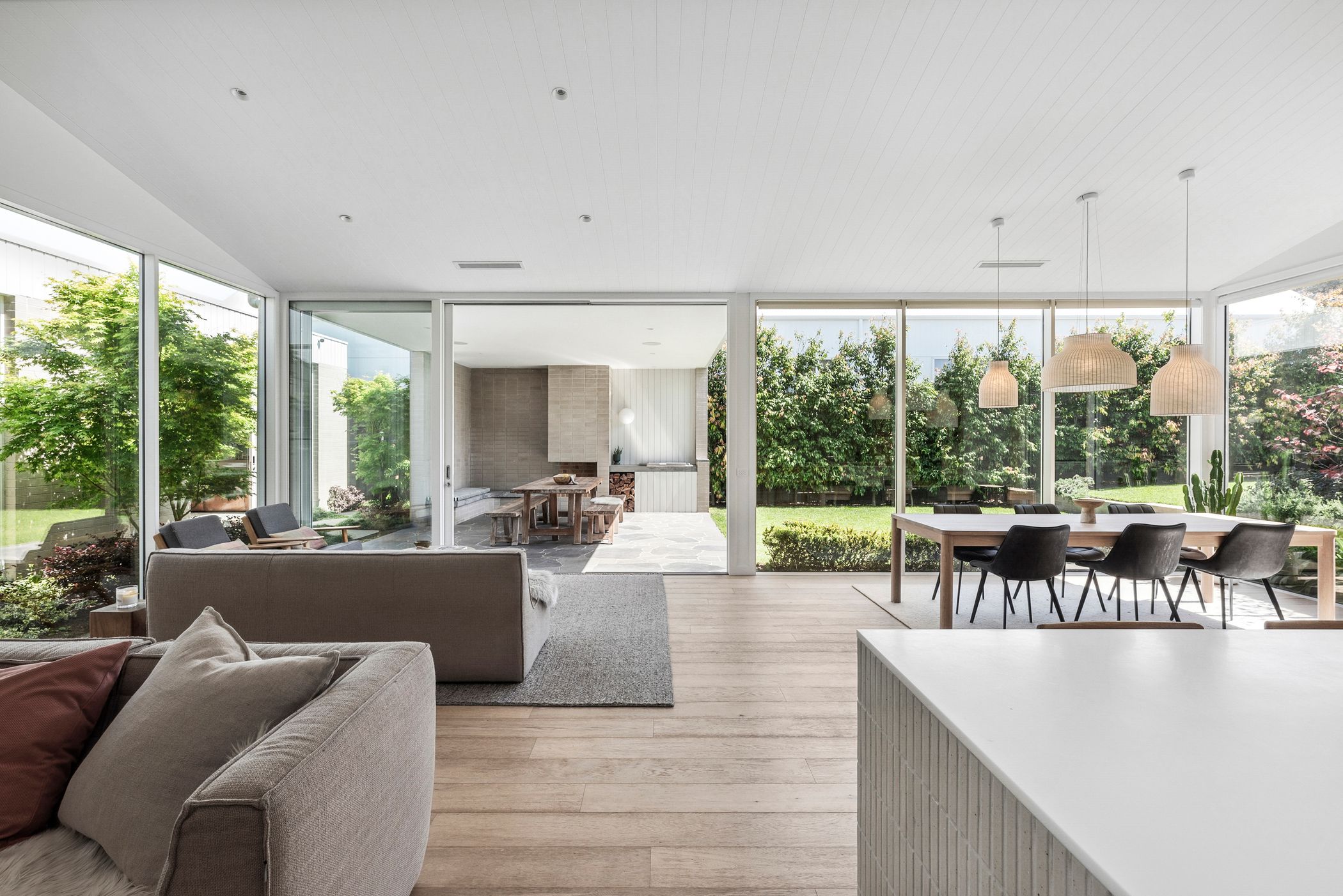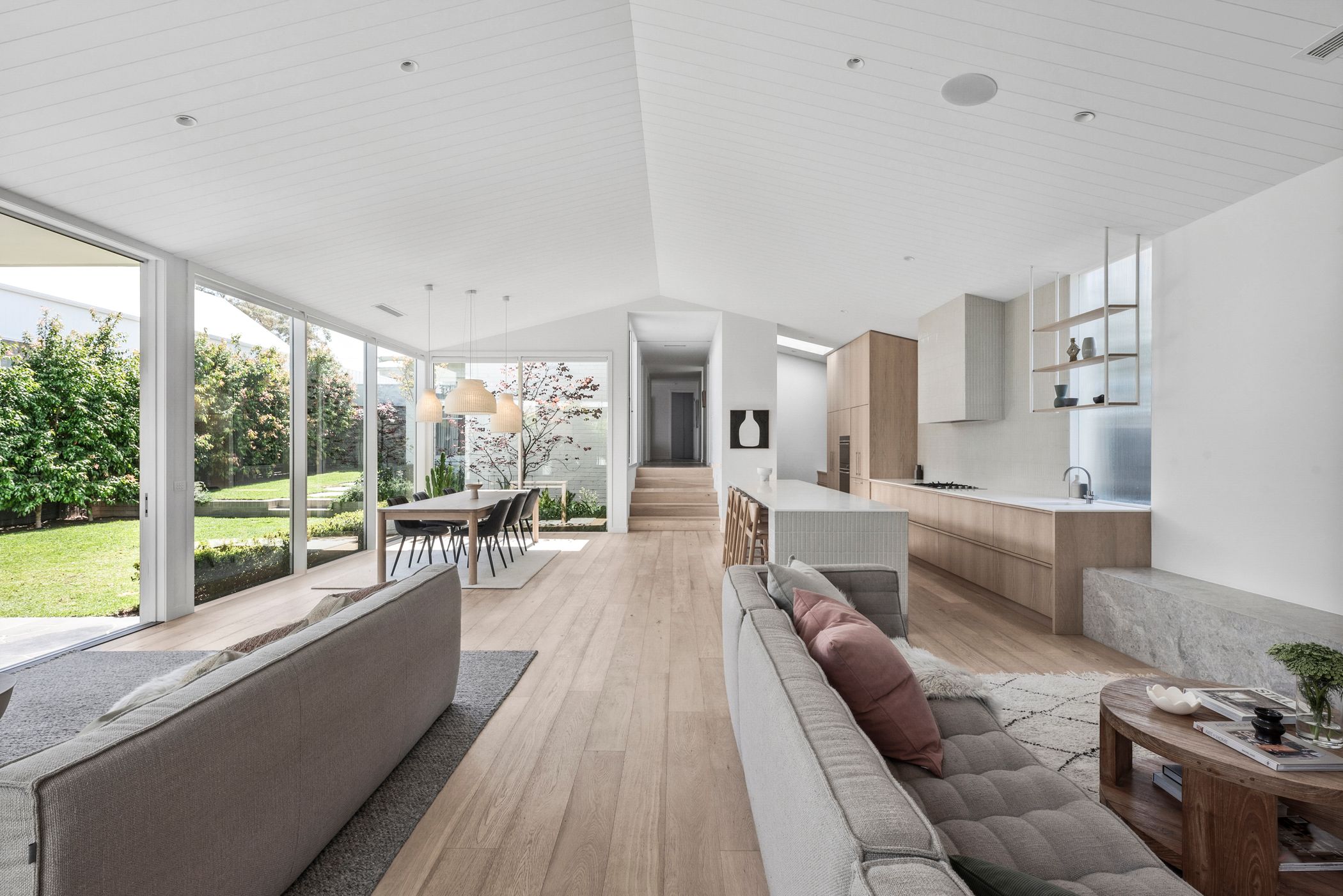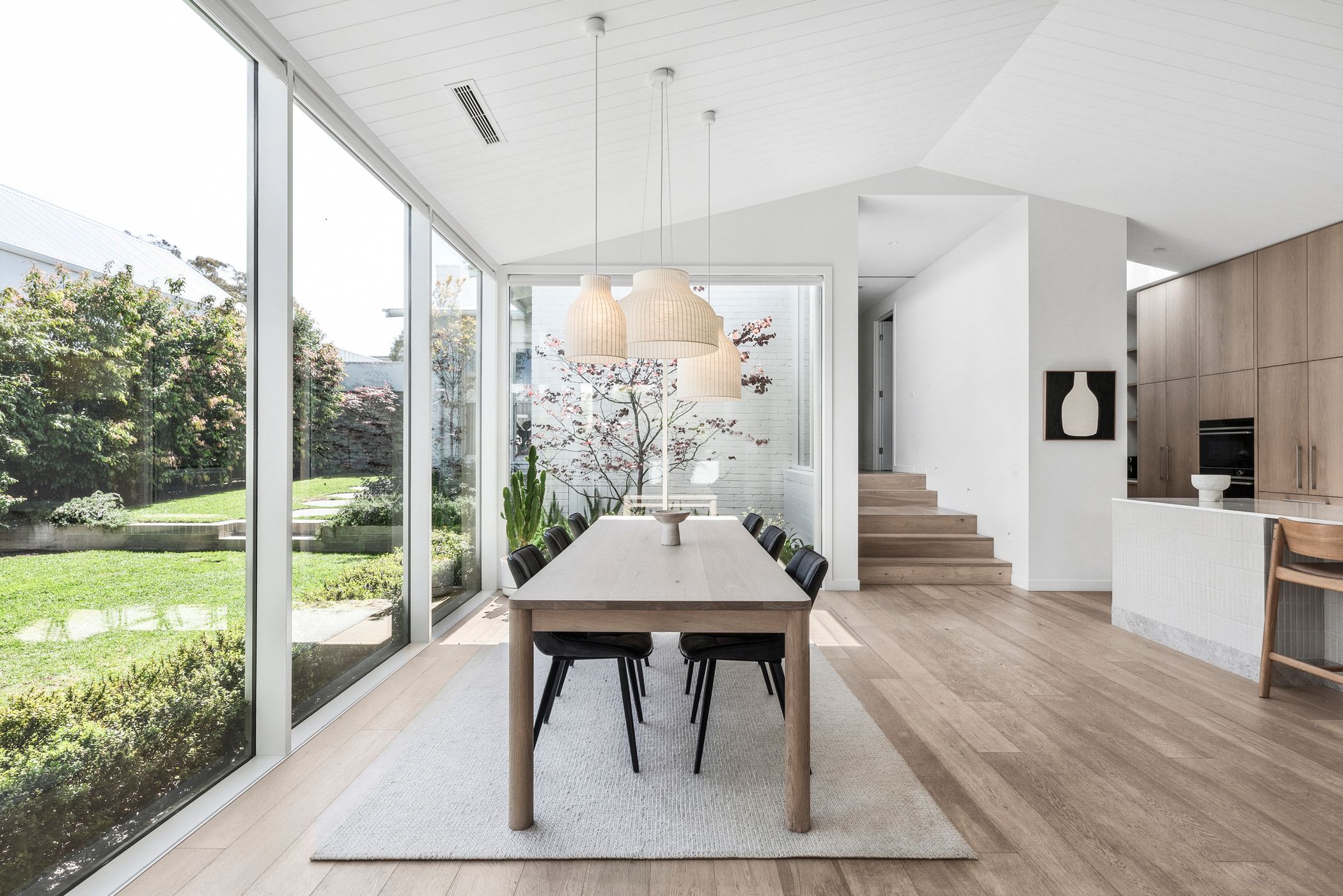 Open Plan Living/Dining: French oak flooring, Muuto pendant cluster in dining space, full-height glazing with remote controlled blinds, Tundra marble shelf/bench, internal courtyard access.