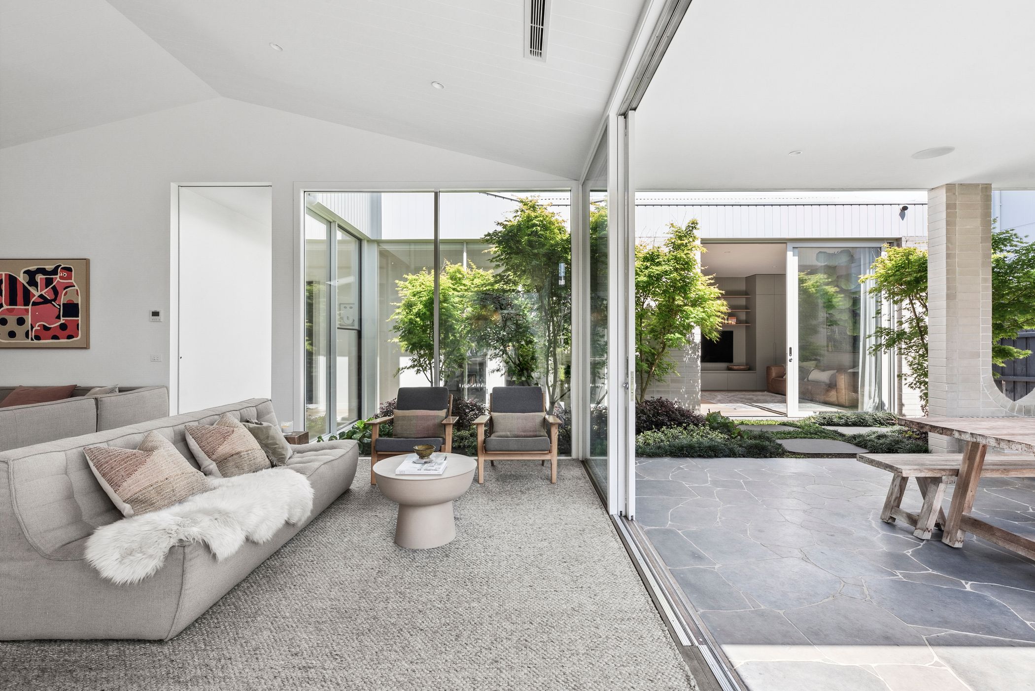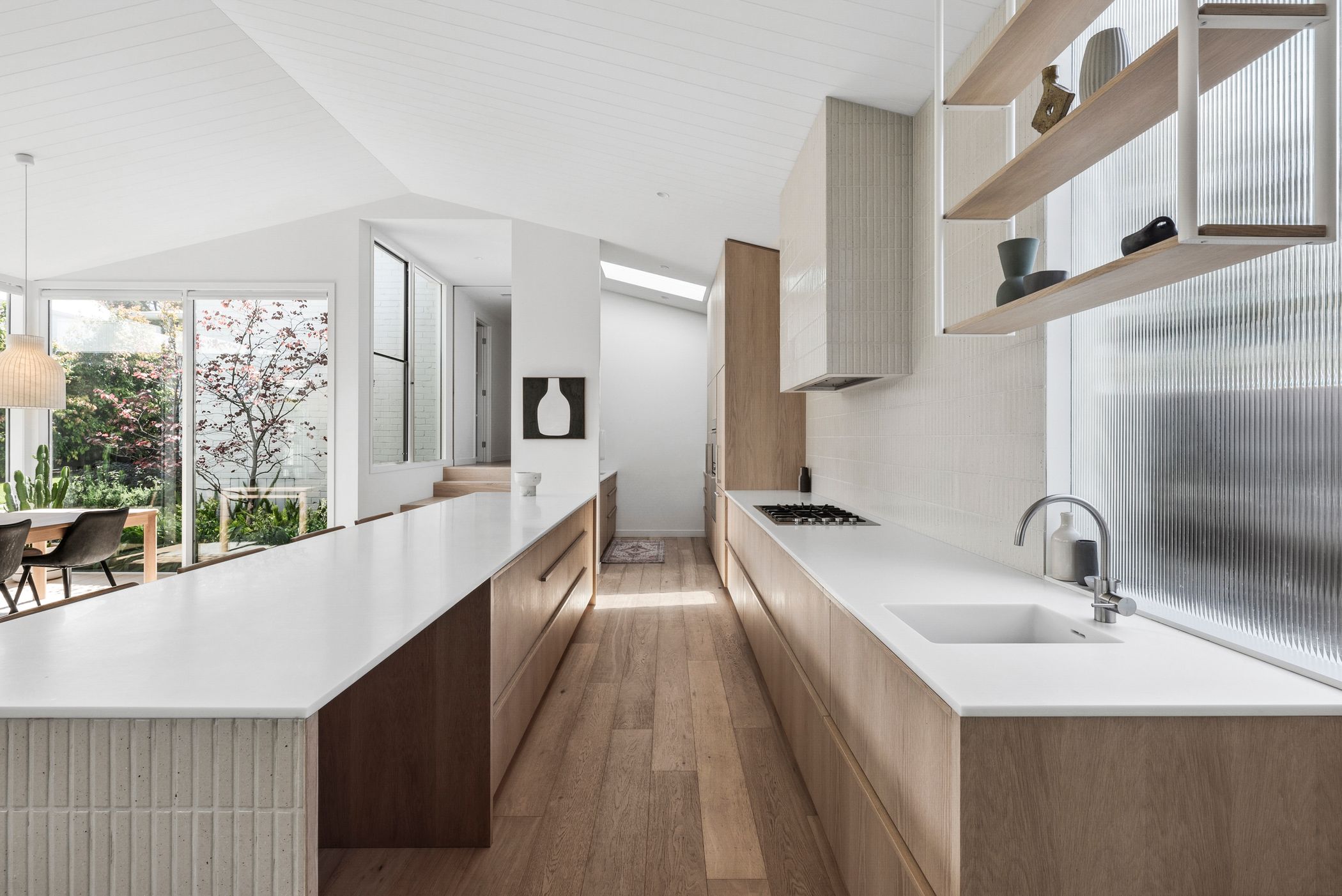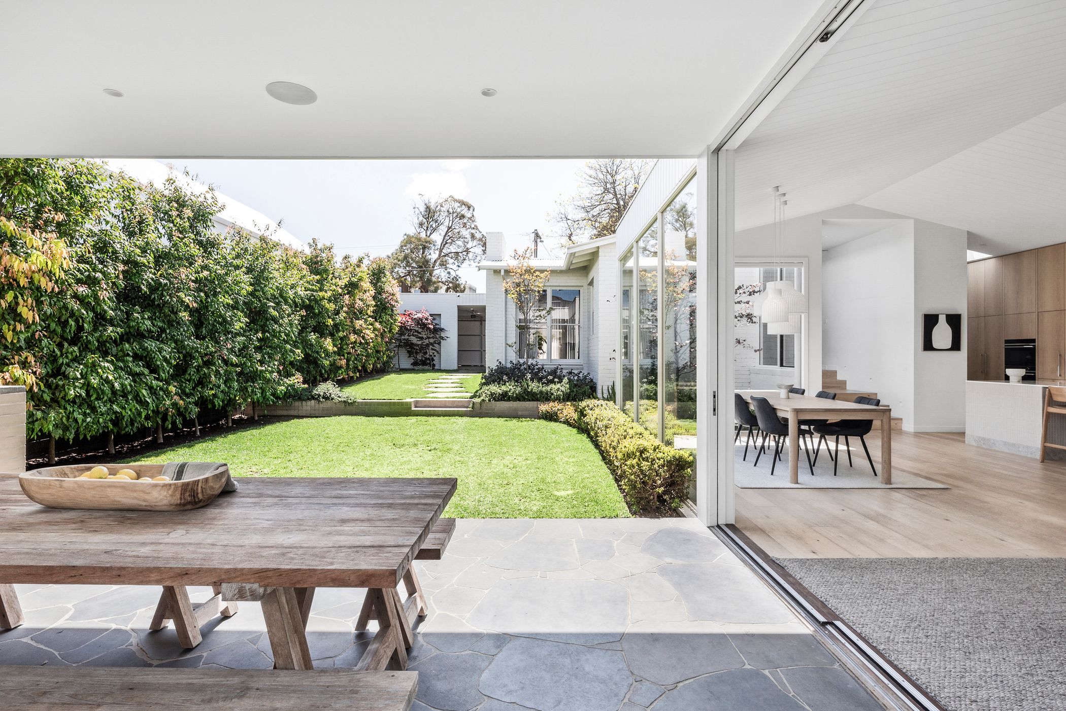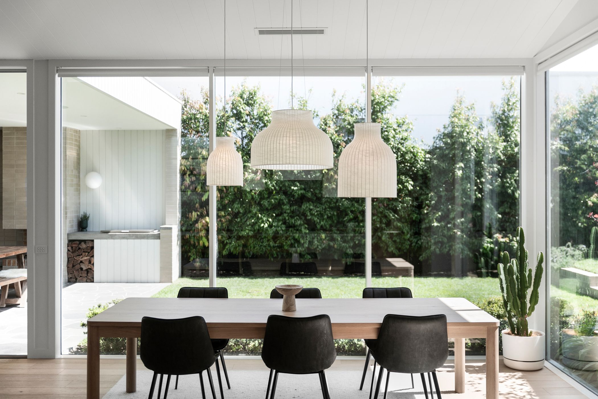 Open Plan Living/Dining: French oak flooring, Muuto pendant cluster in dining space, full-height glazing with remote controlled blinds, Tundra marble shelf/bench, internal courtyard access.