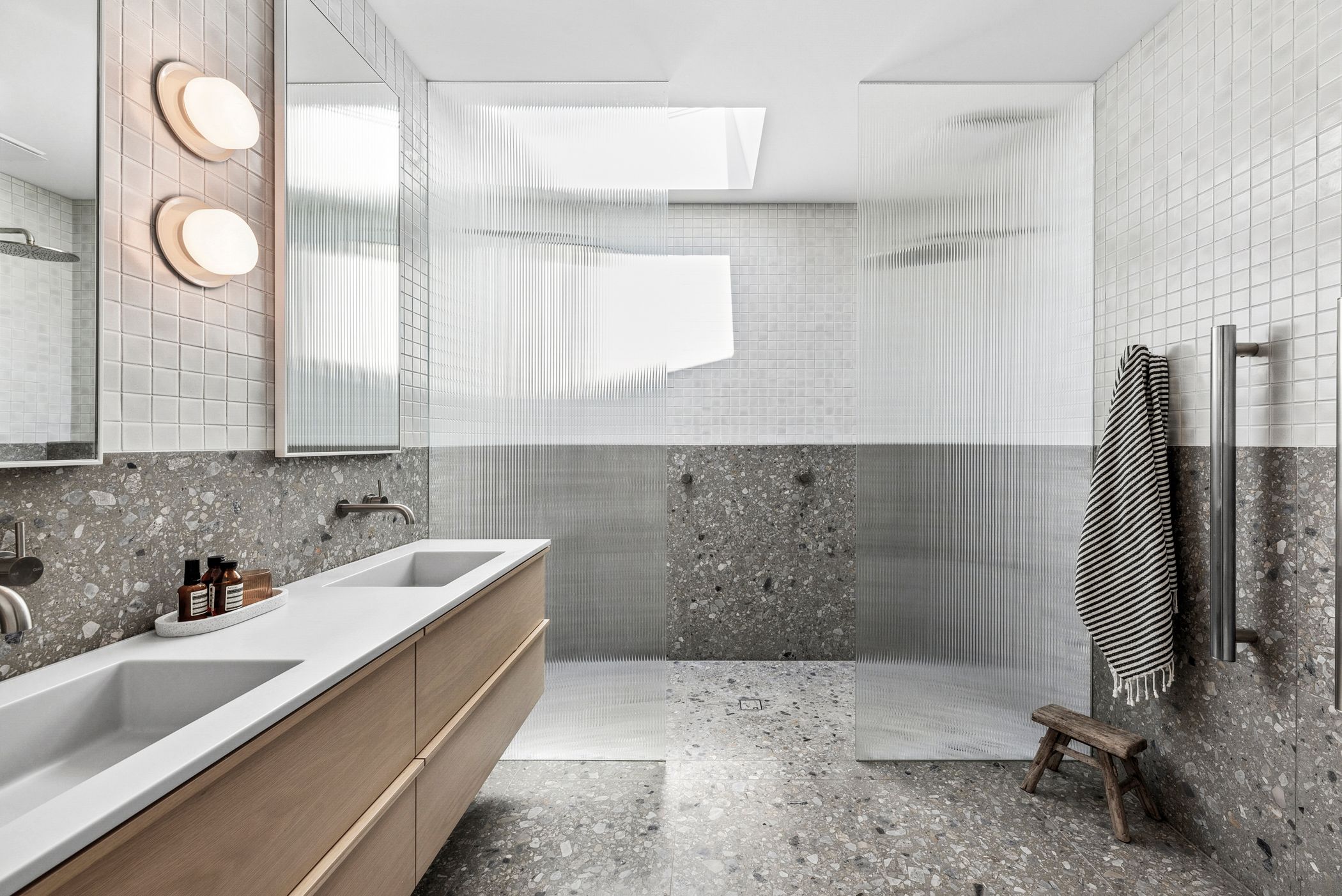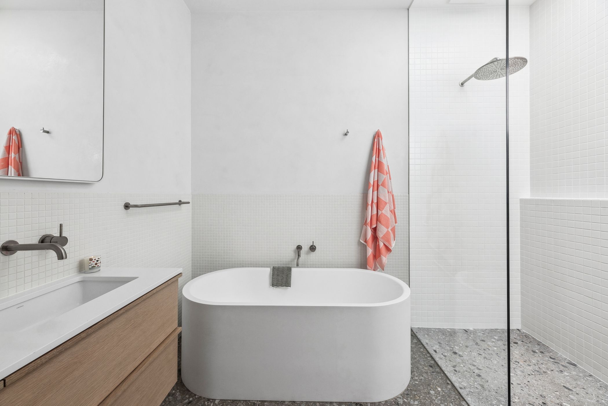 Main Bathroom: Floating vanity with Corian benchtop and integrated sink, freestanding bathtub, Venetian plaster walls, shower, skylight, and feature lighting.