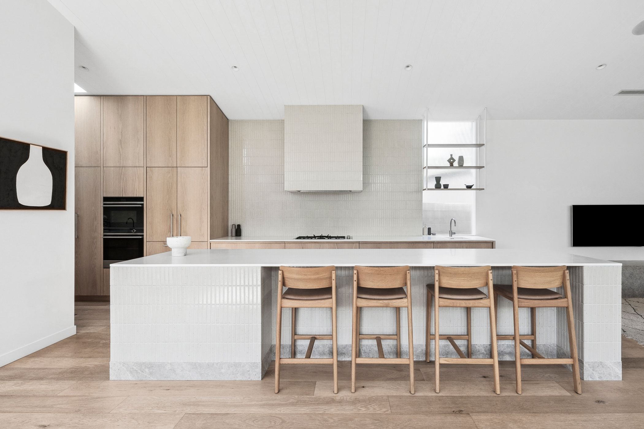 Considered: Kitchen: Full suite of Fisher & Paykel appliances, including a double oven, gas cooktop, integrated fridge/freezer, integrated dishwasher, and cool drawer. Full-height custom joinery, tiled island bench with ‘Glacier Ice’ Corian benchtop and Tundra marble skirt, integrated sinks, and butler’s pantry.