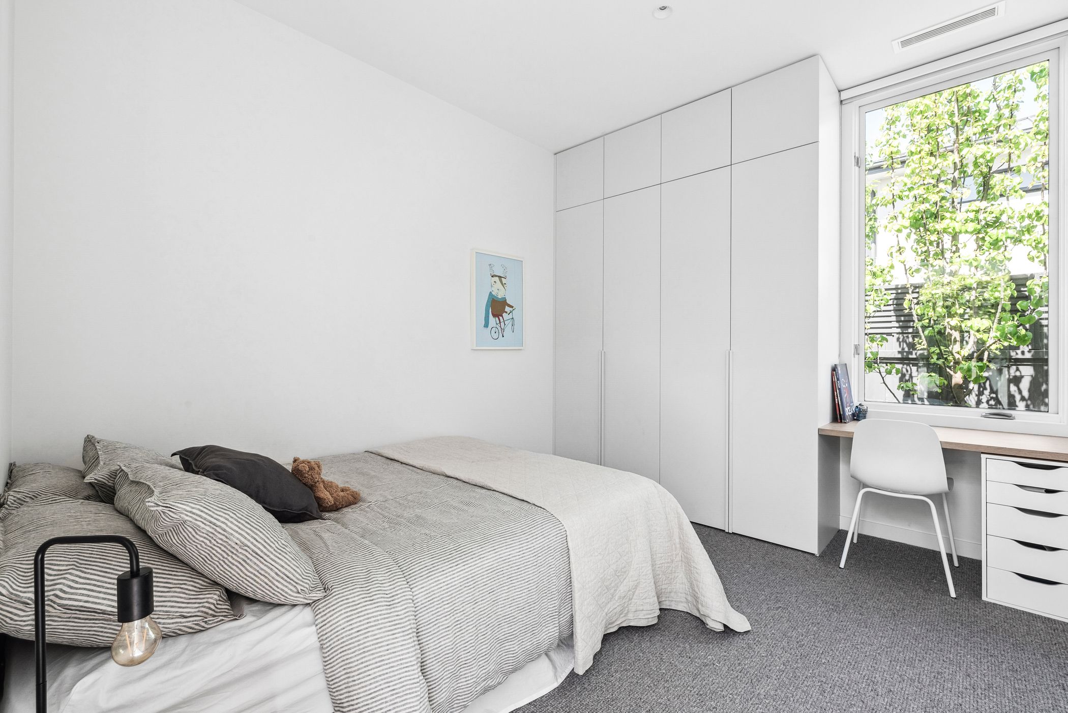 Additional Bedrooms: Three, each sharing in Windsor wool carpet and custom built-in joinery and desk, and nestled alongside a private kids breakout room, featuring custom joinery and doors to the garden.