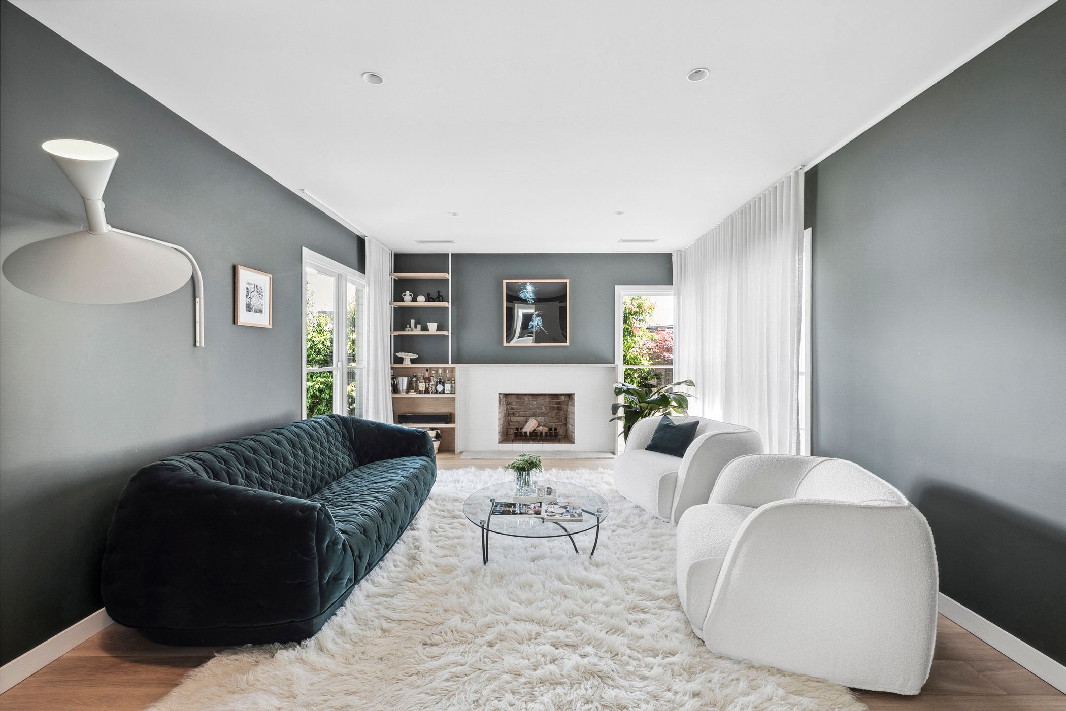 Lounge: Nemo designer lighting, custom built shelving in American white oak, open fireplace with tile surround and Tundra marble hearth. Full-height sheer curtains, French oak flooring.
