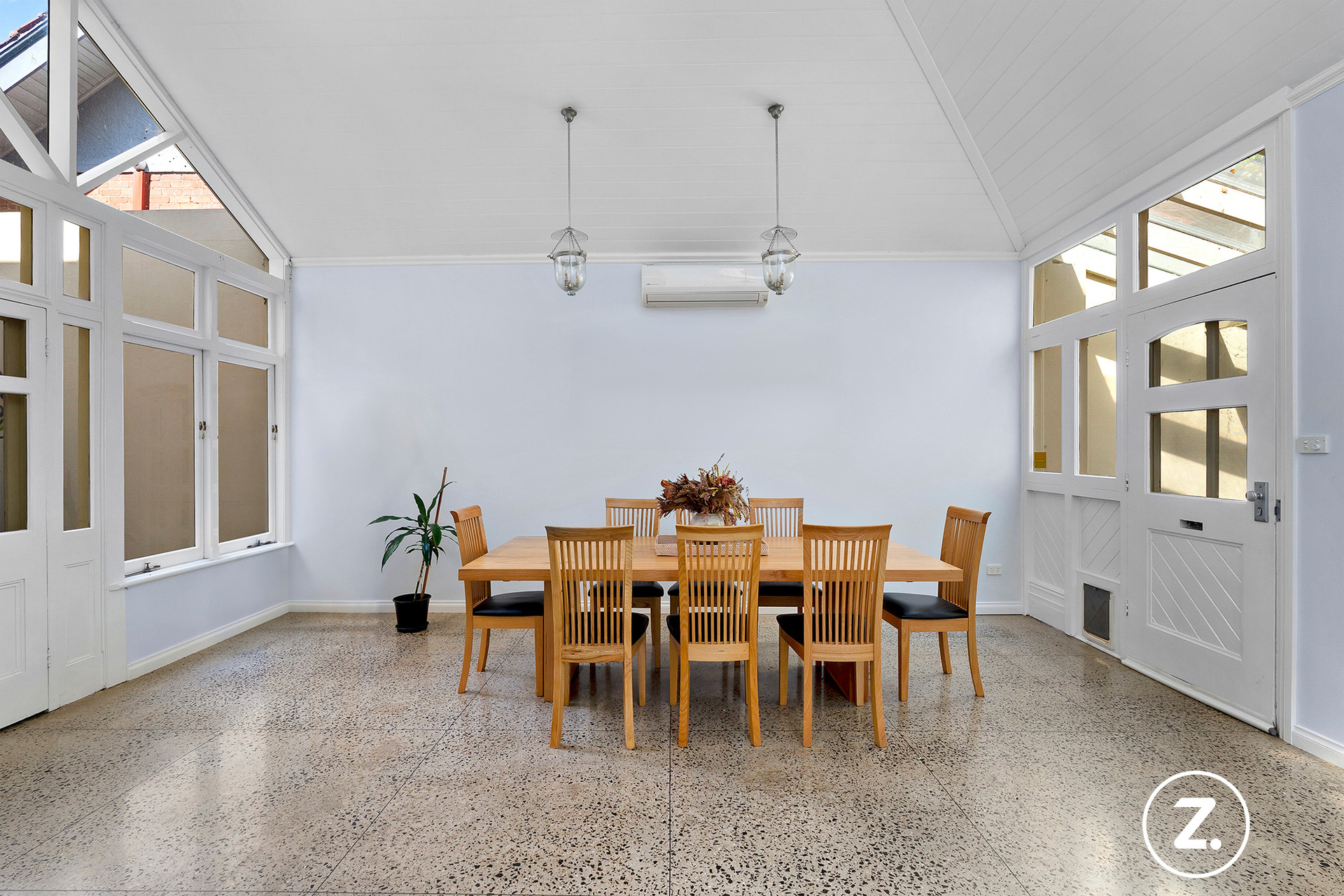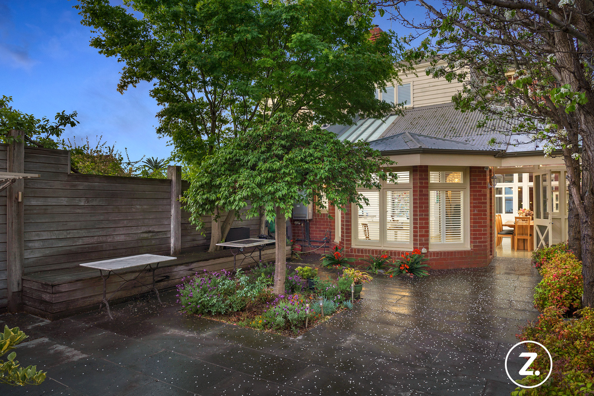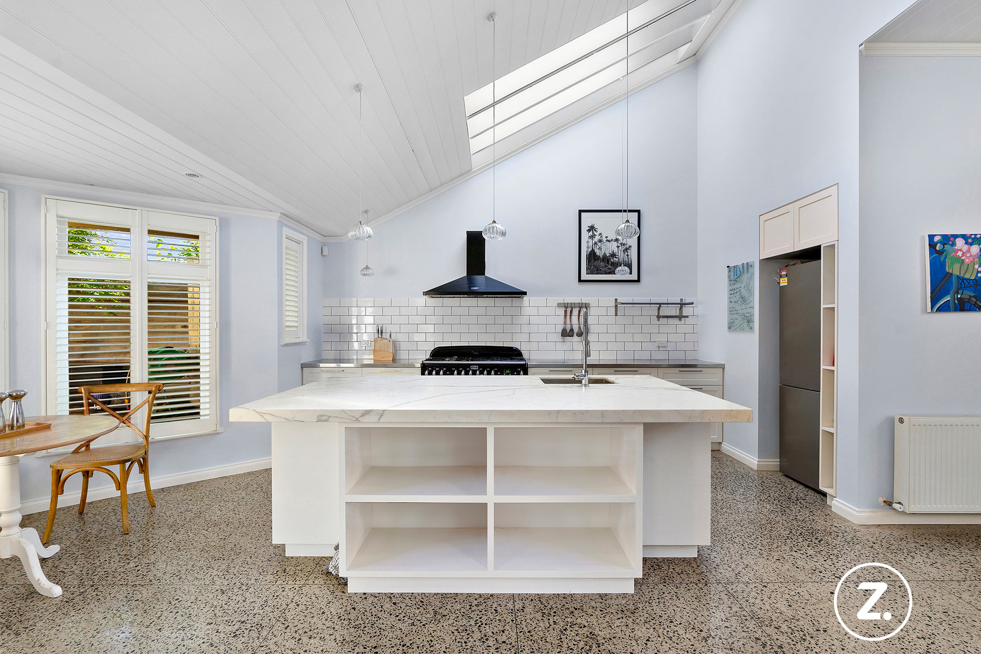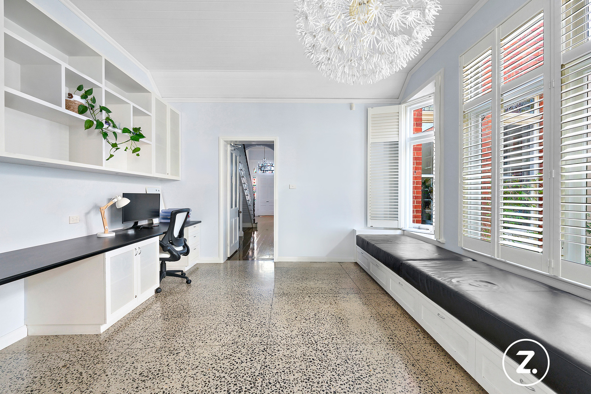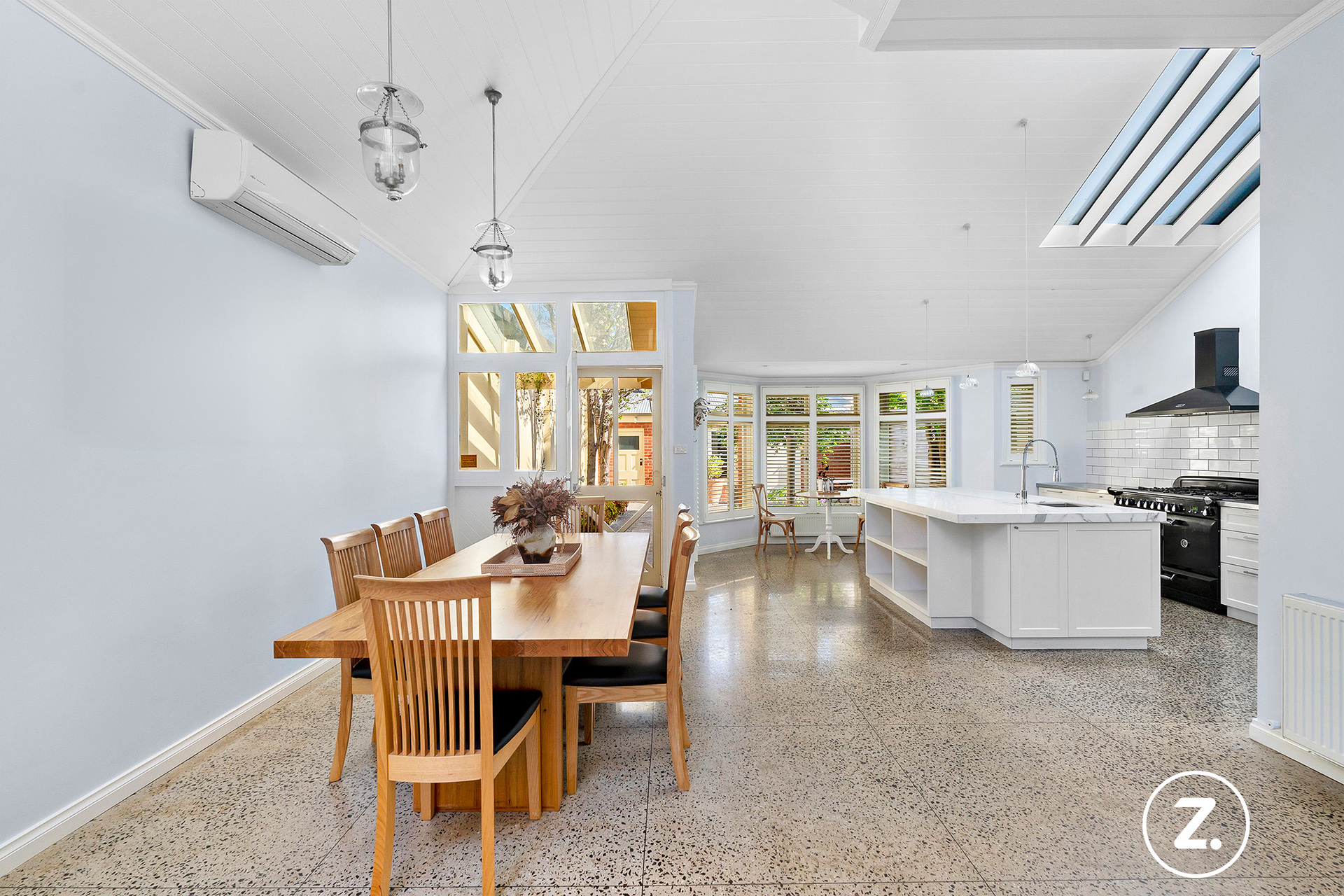 At the rear of the home, the design opens up into a light-filled open-plan kitchen, living, and dining area. The kitchen is a chef's dream, complete with Carrara marble benchtops, a Falcon oven, and polished concrete floors with underfloor heating, blending functionality with exquisite style. A serene courtyard floods the space with natural light, creating a tranquil transition between the living areas. A thoughtfully designed home office or study doubles as a sitting room adjacent to the sun-drenched courtyard.