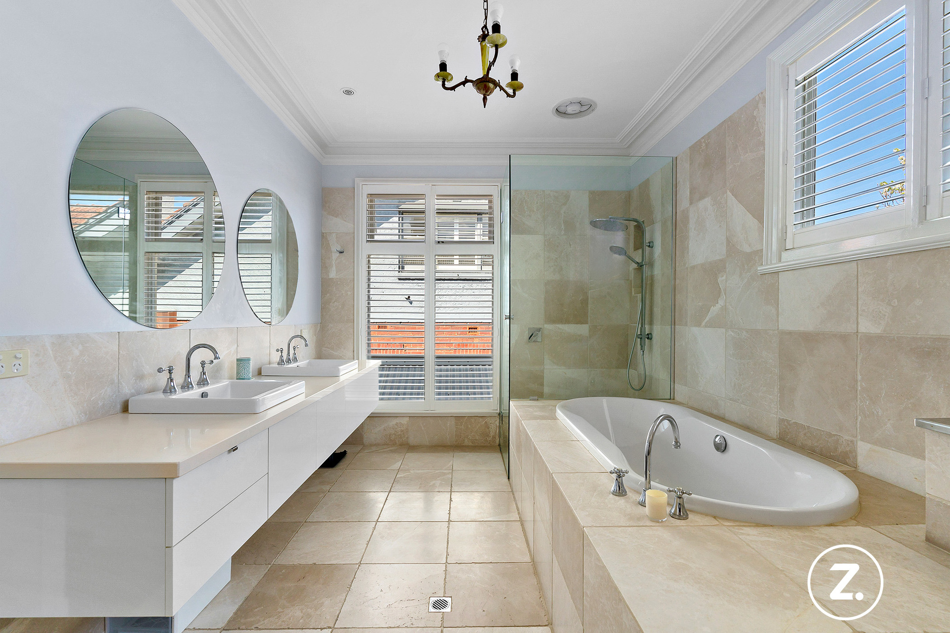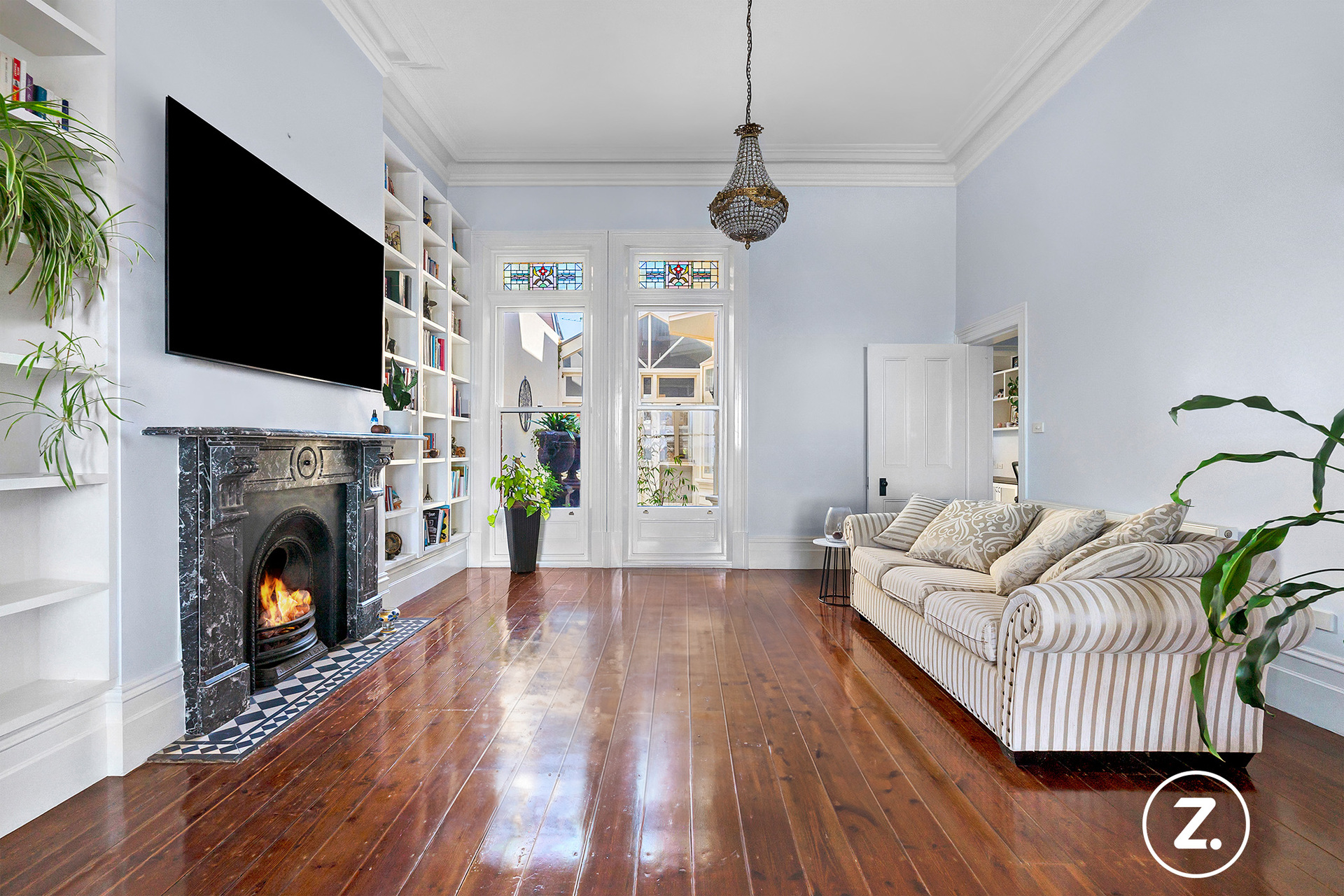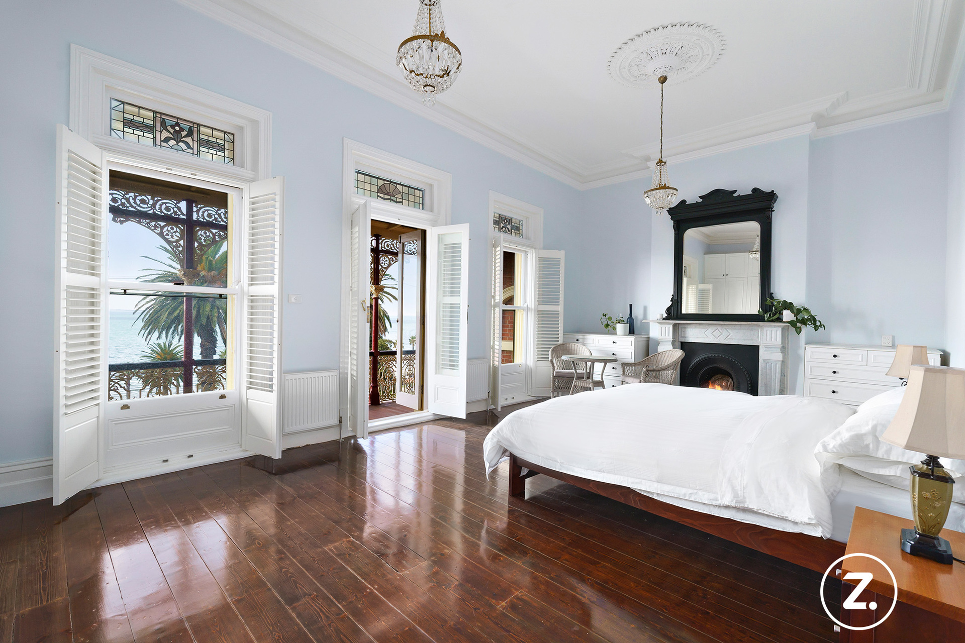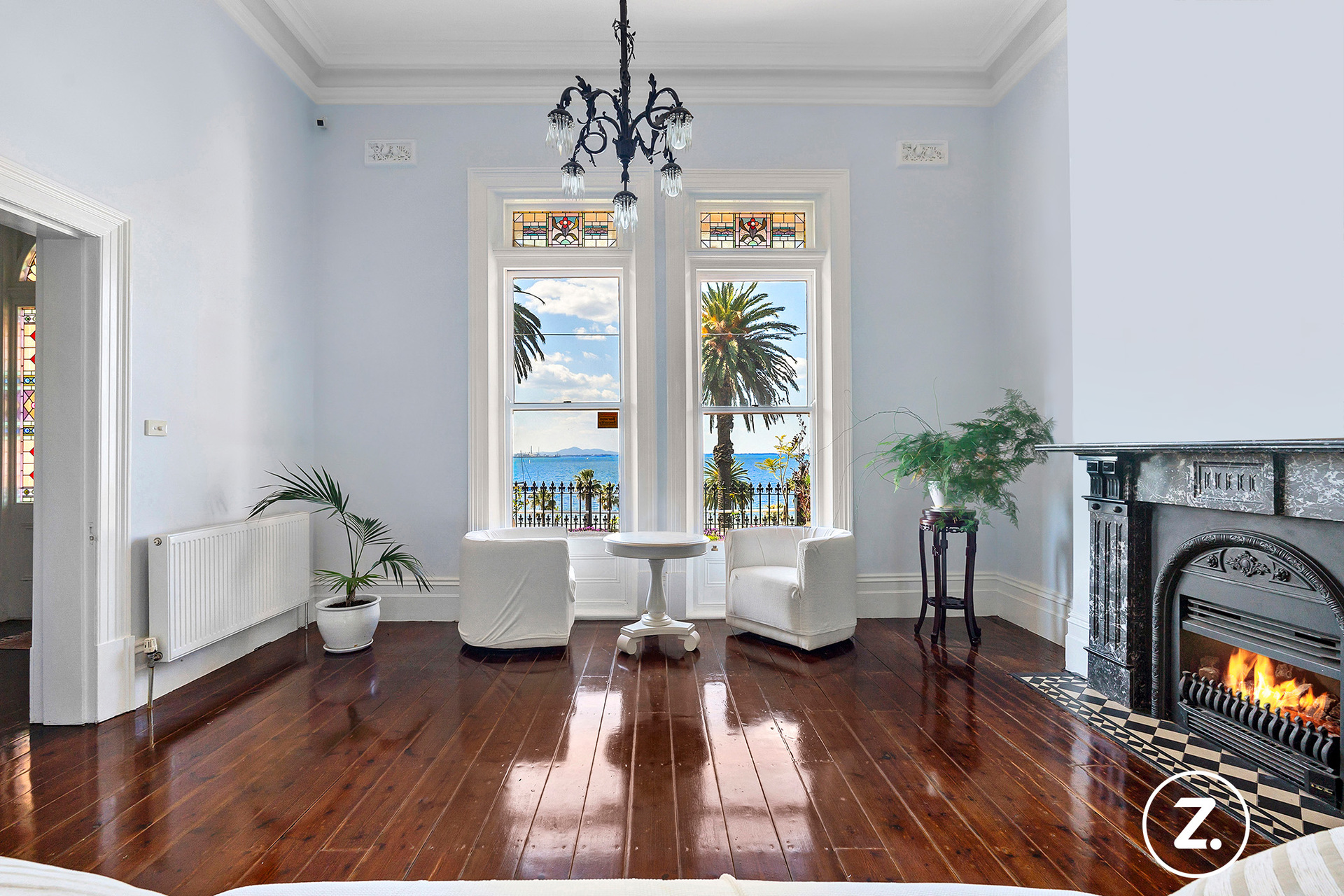 The formal dining room flows effortlessly into the living room, both spaces perfectly positioned to capture the panoramic water views. Polished floorboards, original marble fireplaces, and feature lighting sourced from around the globe create an atmosphere of warmth and distinction. A striking staircase, flanked by rich architectural detailing, adds to the property's sense of old-world charm while complementing its modern enhancements.