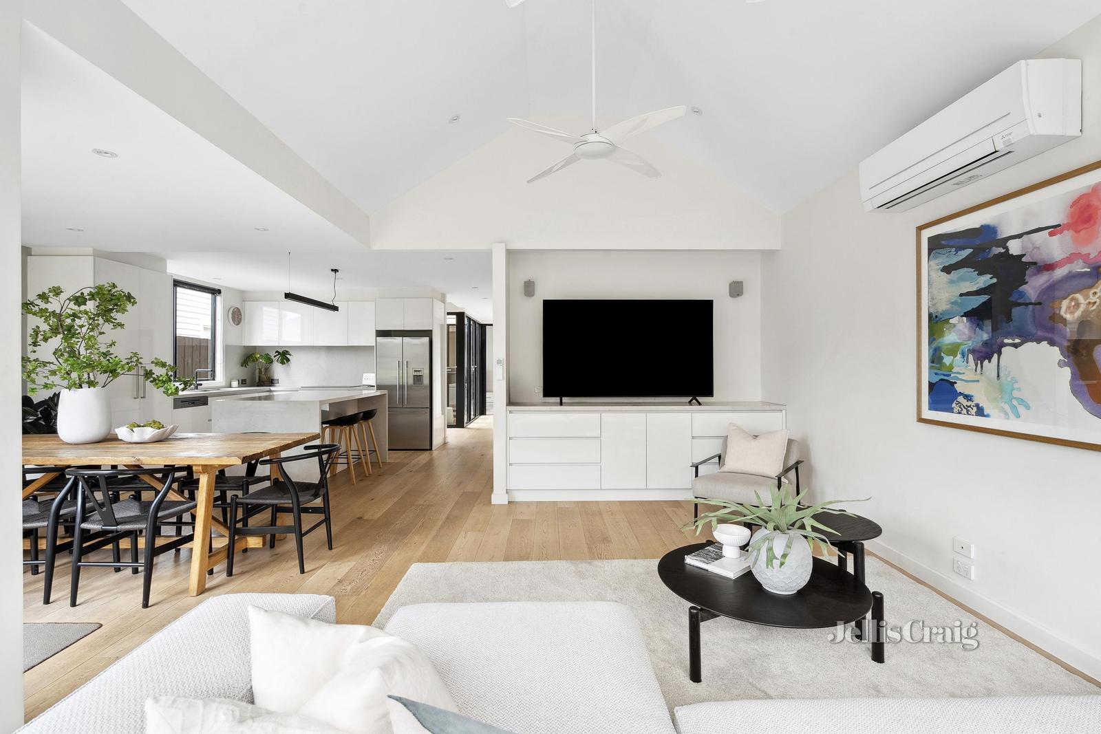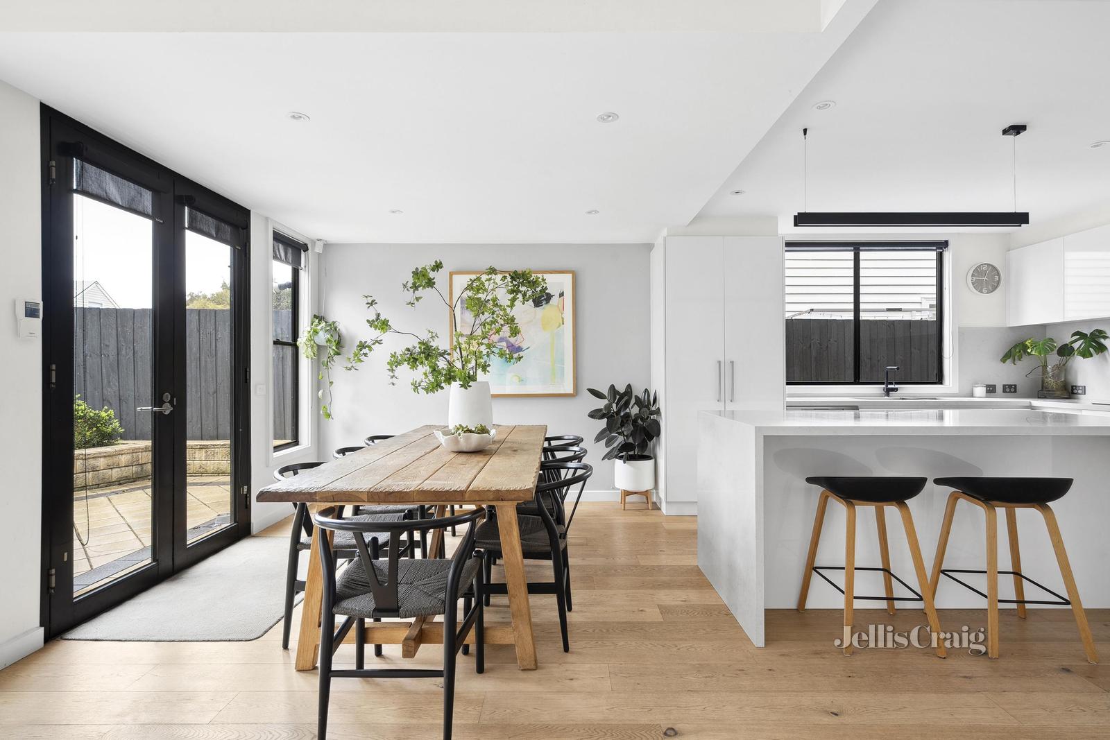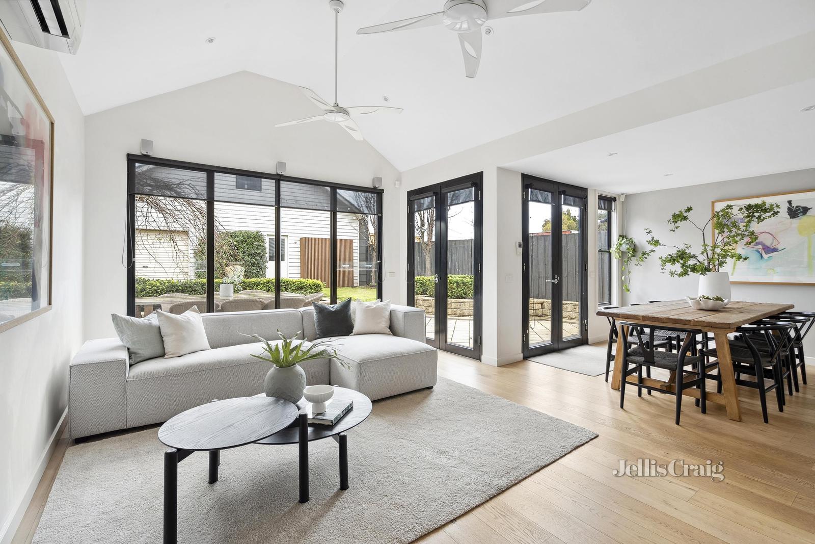 At the end of the hall the home opens into an open-plan kitchen, dining, and living area boasting vaulted ceilings and views of the back garden. This wonderful space is perfect for family living and entertaining, featuring quality stainless appliances, including an integrated dishwasher and induction cooktop. The living areas seamlessly connects to an inviting outdoor space through two sets of double doors.