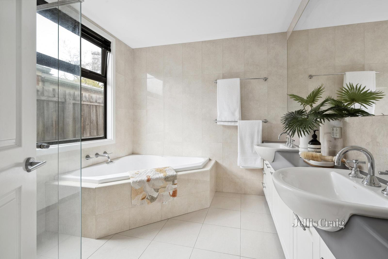 A large laundry and a luxurious family bathroom, complete with floor-to-ceiling tiles, a spa bath, double vanity basins, and a shower, cater perfectly to family needs.