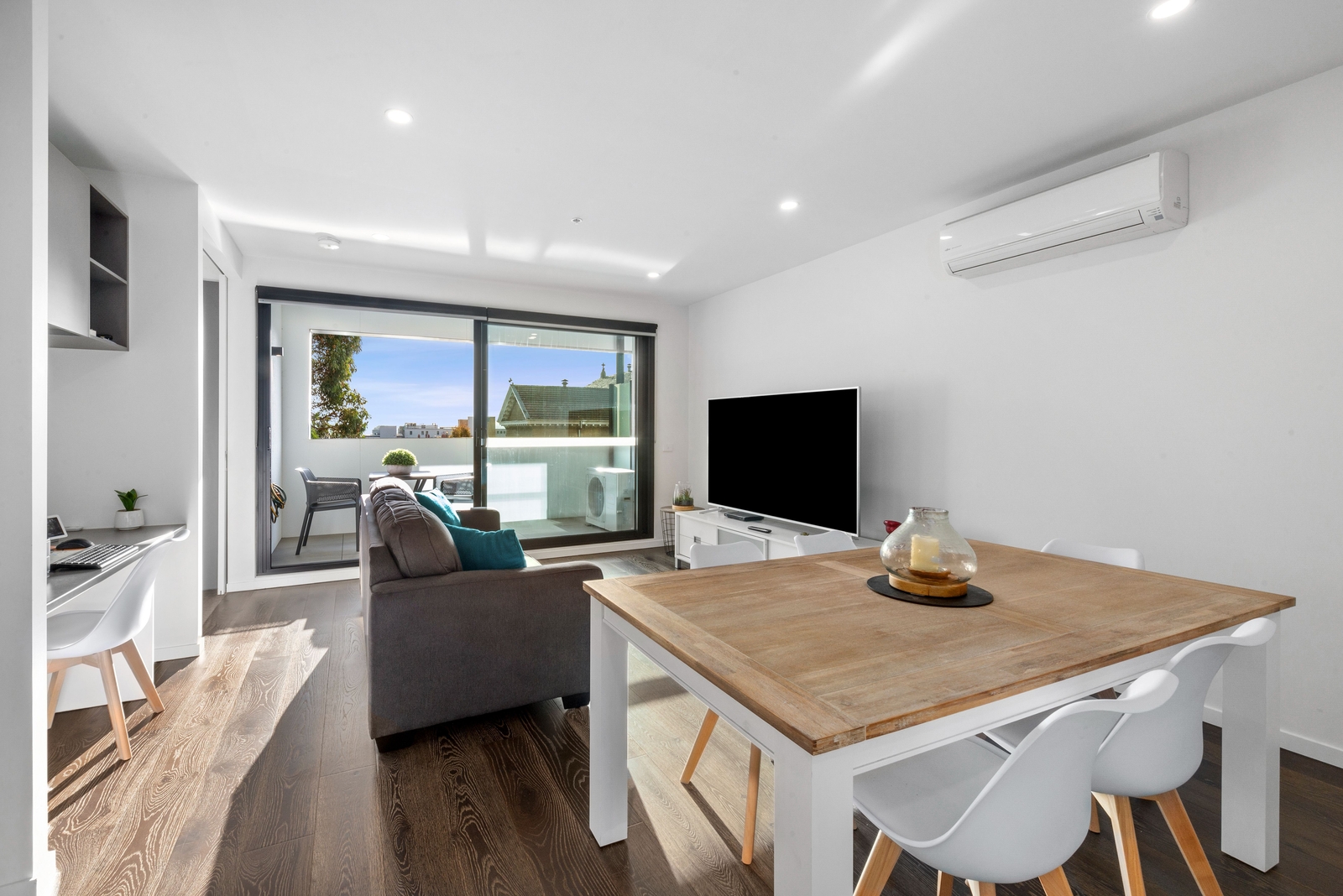 On entry to the apartment, the open plan layout is spacious, with its corner position allowing natural light